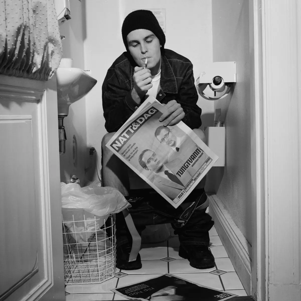 Tiden var knapp, det ene tok det andre, og fotograf og artist fant ut at den mest interessante spoten å fotografere var på do. Der lå det en ny utgave av gratisavisa Natt&Dag og slang, og det ga et metanivå til bildet i og med at hiphopduoen Tungtvann er coverboys på bladet. Et ekstra metanivå er at begge bildene henger utstilt i hiphop-utstillingen på Preus museum!