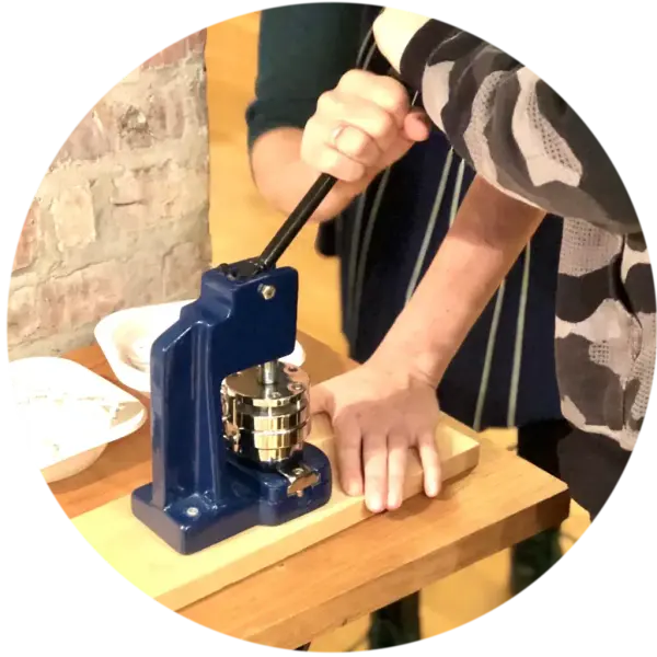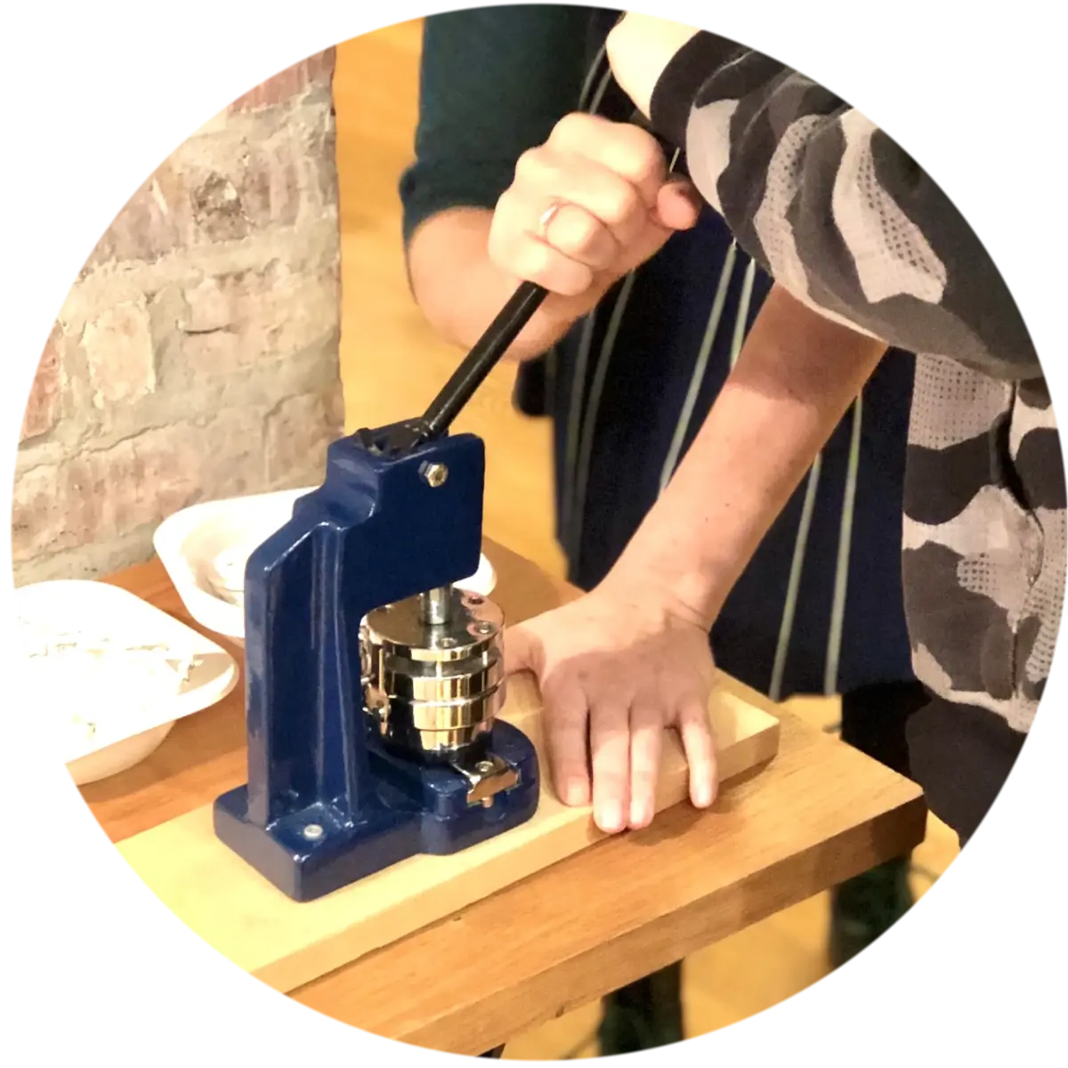 Elevene klipper ut det de selv ønsker fra blader og ferdige ark med utklipp vi har tilgjengelig, og komponerer sitt lille kunstverk på en sirkel. Deretter kjører vi kollasjen gjennom den magiske buttonsmaskinen.