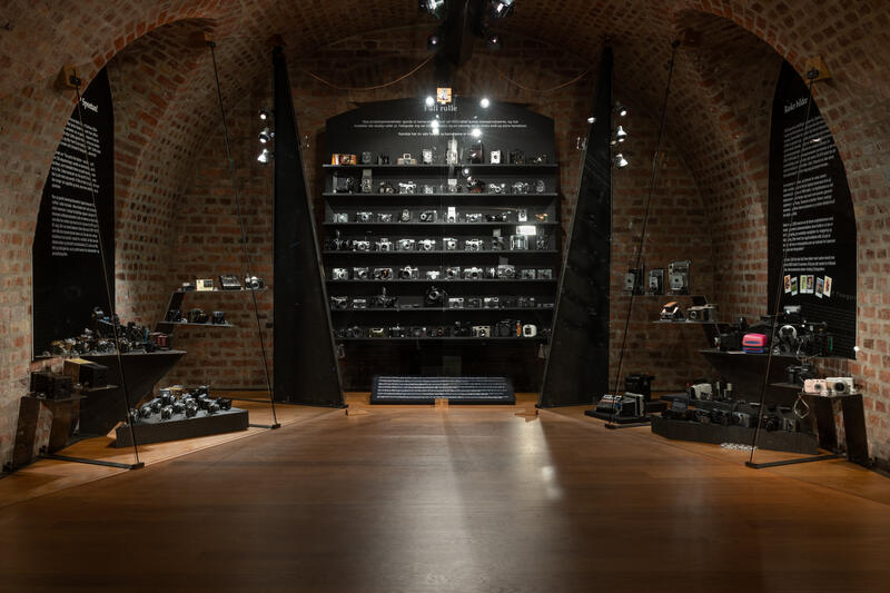 Noen få av kameraene i Preus museums samling som har sett litt av verdens små og store begivenheter. Og skyer. (foto: Ana Goncalves. Animasjon: Ingri Østerholt)