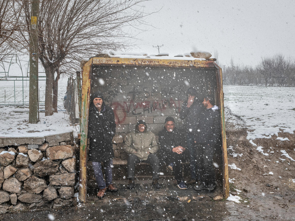 © Mustafa Bilge Satkın, Drowned History, 2020. Village residents watch the snowfall at the old bus stop. The bus will no longer pass from this stop since the roads of this village have been flooded. - 8/9