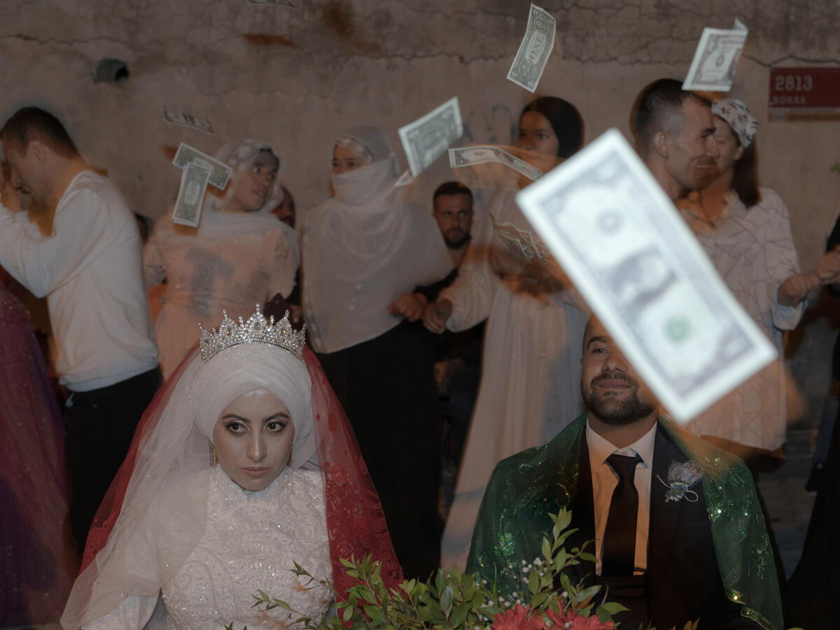 © Mustafa Bilge Satkın, Drowned History, 2020. A wedding on the street in the city suburbs. People migrating from the village to the city are facing some cultural changes. Tossing fake dollars at celebrations in the city suburbs is now one of the new wedding normals. - 3/9