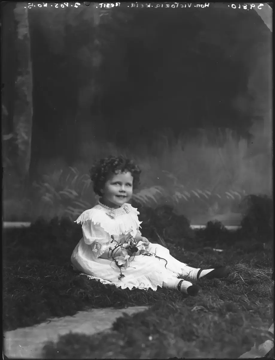 Vi har ei tulle i samlingen vår. Hun har krøller og hvit kjole på, og sånn kunne en kjent barnesang vært spunnet videre på. Det er lett å bli musikalsk når man ser portrettene tatt av portrettstudioet Bassano Ltd. Fotografiene er vakre og kreative. I Preus museums samling har vi rundt 600 portretter fra studioet, de fleste av barn, og de viser oss datidens portretttradisjoner og trender. Her er det bruk av rekvisitter som leker, bøker, utkledningstøy og backdrops. På dette fotografiet ser vi Miss Victoria Reid som har fått noen kvister med blomster i fanget og er plassert i et skoglandskap.