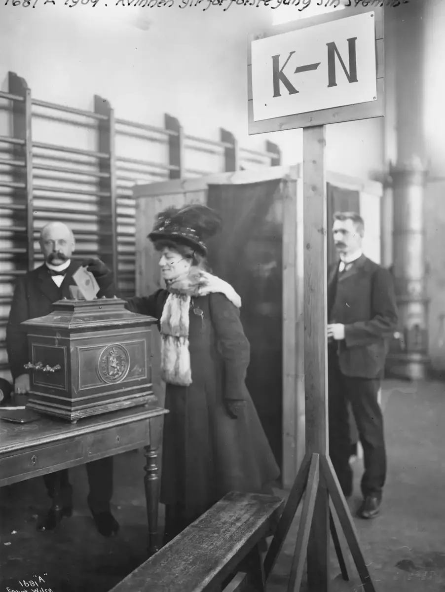Spenningen og gleden var nok ikke noe mindre i 1909, da kvinner fra middelklassen og borgerklassen, for første gang kunne legge den utvalgte seddelen i urnen. På bildet, tatt av Anders Beer Wilse, ser vi en smilende kvinne som stemmer, i kjente omgivelser; i en gymsal med ribbevegger. Godt valg alle sammen!