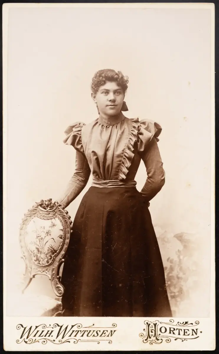 Dette bildet er antagelig fra begynnelsen av 1900-tallet, da visittkortperioden var på hell. Det ser vi både fordi fotograf Wittusen var aktiv i Horten fra 1896–1931, og på grunn av klesdrakten.