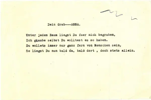Men det finnes også andre fortellinger. På Preus museum har vi en liten samling av fotografier, brev, postkort, artikler og manuskripter etter Madame d´Ora. I dette arkivet finnes et lite dikt om fotografens søster, Anna Kallmus, som døde i Chelmno konsentrasjonsleir i Polen i 1944. Diktet har fått tittelen: Din grav – Anna, og første setningen lyder: «Under hvert tre ligger du for meg begravet.»