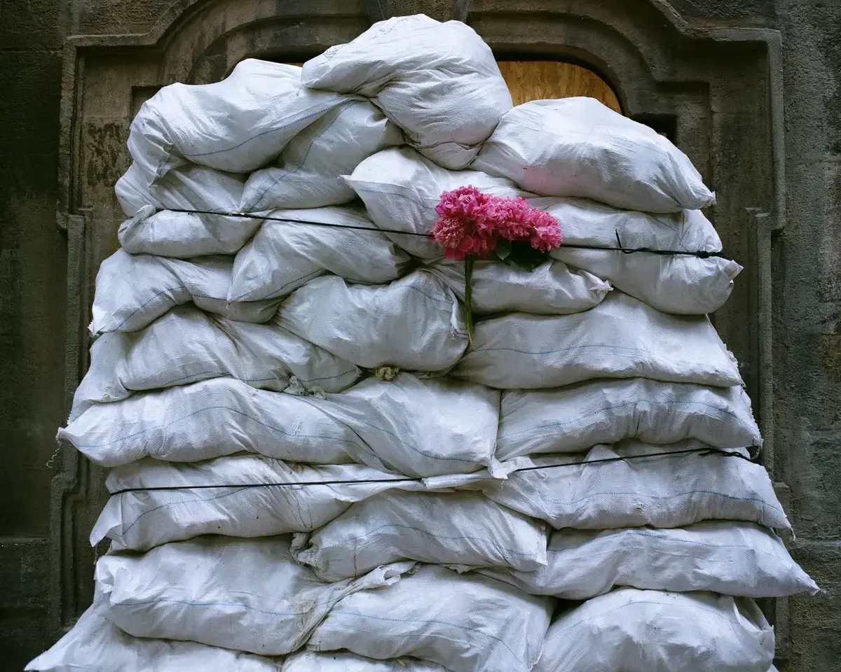 Lviv, Ukraine, 2023. Sandbags protecting the Greek Catholic church of the Holy Eucharist in Lviv. Anya Tsaruk